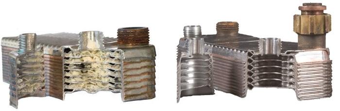 Si l'échangeur à plaques de la chaudière est déjà entartré, il doit être détartré voir changé dans les cas lesplus sévère, de même pour l'accumulateur d’eau chaude, le chauffe-eau, la tuyauterie et les robinets, avec une détartreuse contenant de l'acide détartrant (acide chloridrique).